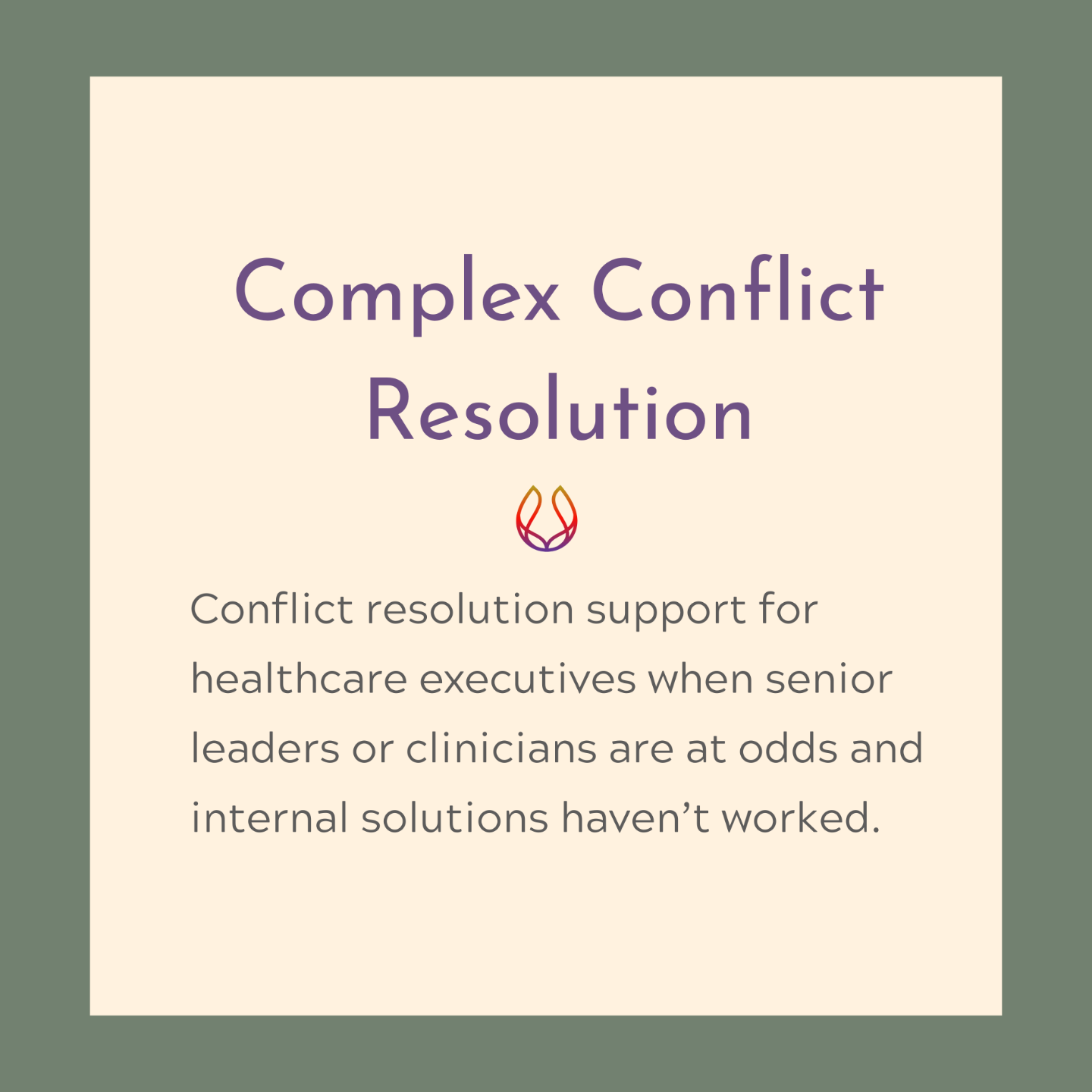 I facilitate the resolution process for you, working directly with the hard-to-replace clinicians and/or leaders involved in the conflict.